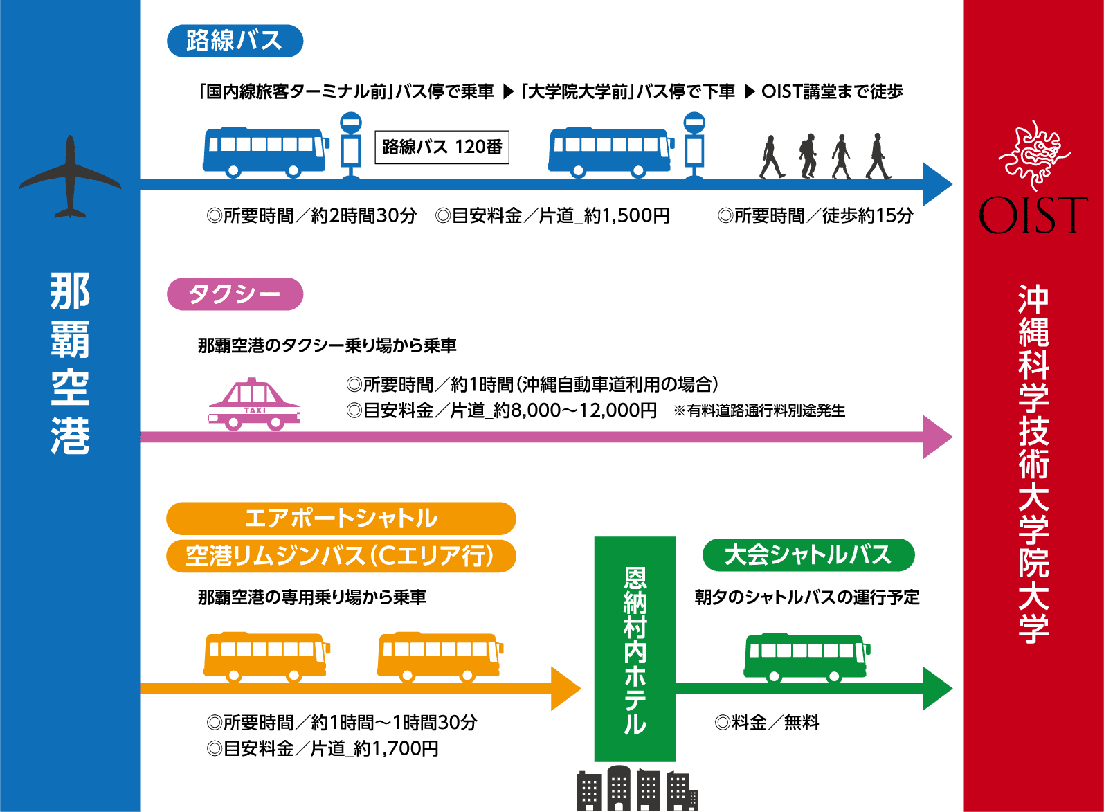 OISTにはNMR討論会参加者用の駐車場はありません。レンタカー・自家用車でのアクセスは禁止されています。恩納村内の駐車場をご利用の上、シャトルバスで会場までお越しください。